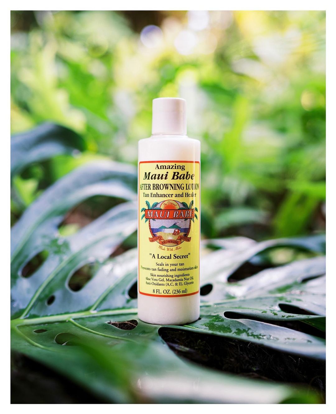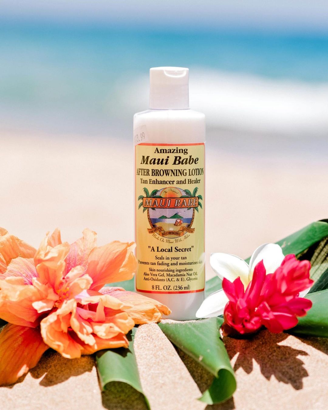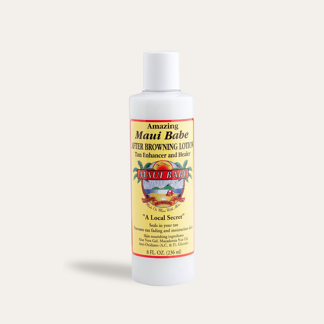 Amazing Maui Babe After Browning Lotion aids in healing skin damaged by the sun, salt, and wind. Seal your deep, dark tan and prevent peeling and flaking by using our After Sun lotion made with all-natural ingredients like macadamia nut oil and aloe vera. It is lightweight in consistency and great to use during all seasons of the year to keep your skin smooth, hydrated, and rejuvenated. Enjoy enhancing and healing your tan with “A Local Secret.”